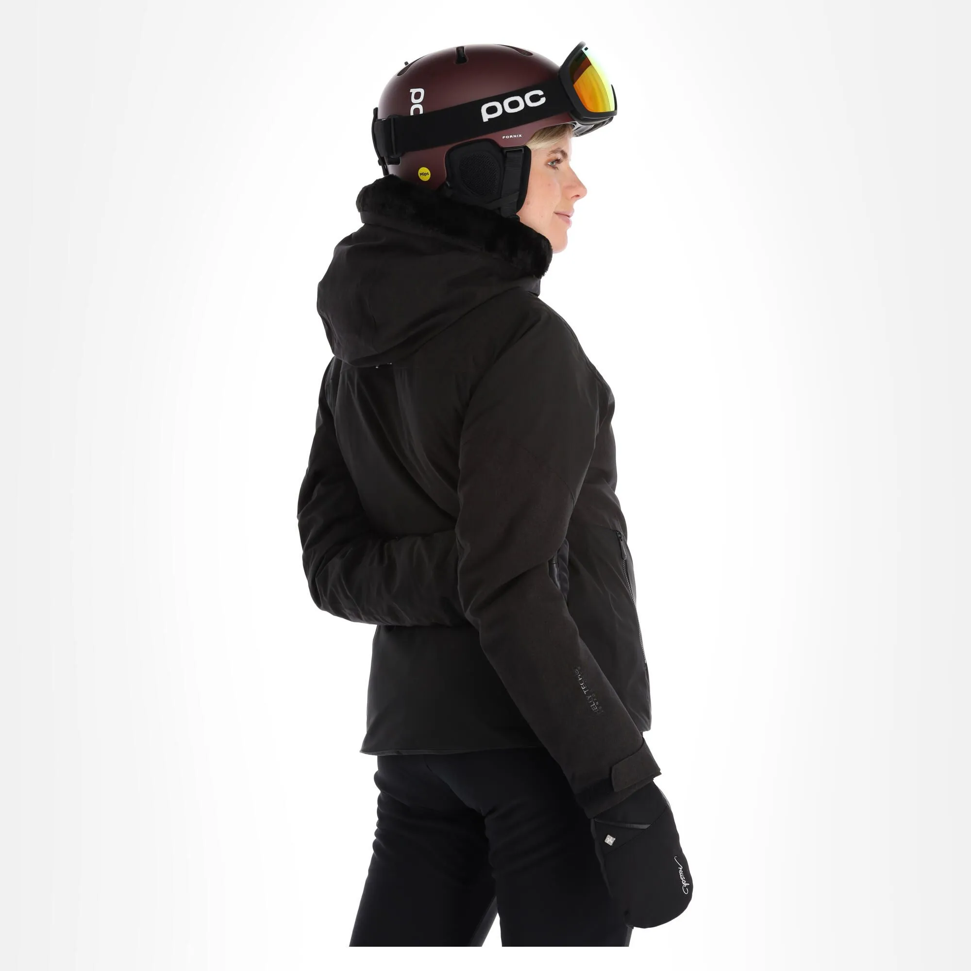 - Kapuze passt über Helm Die Kapuze der Skijacke passt über einen Helm.
