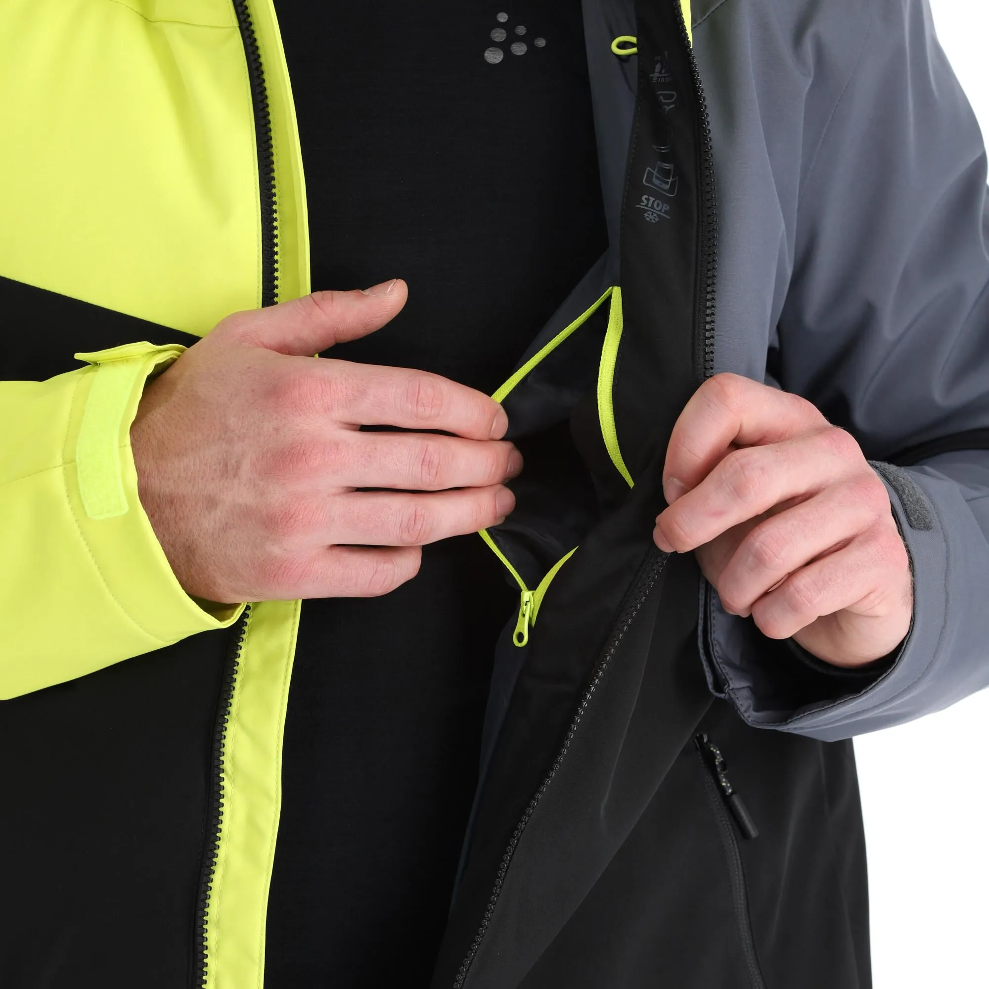 - Mobiltelefon-Tasche Die Skijacke besitzt eine extra Jackentasche, in der du dein Handy verstauen kannst, während du unterwegs bist.